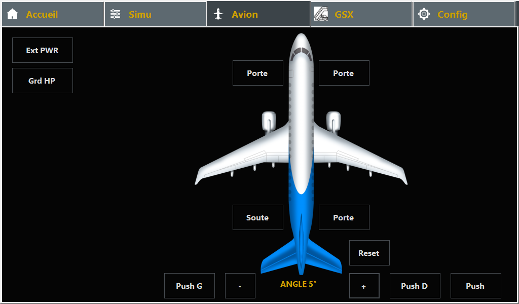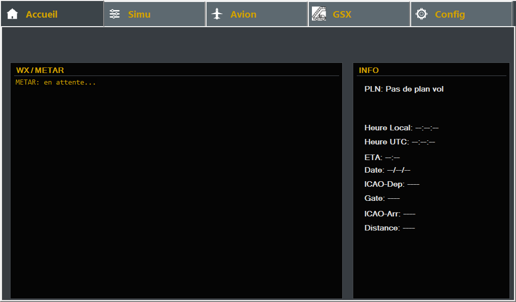 Onglets : Accueil, Simu, Avion, GSX, Config